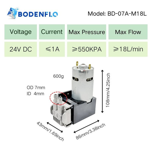 24V Mini Air Pump with 5.5-6.5bar High Pressure 18/24/35L Flow for Various Applications BD-07A-M BODENFLO